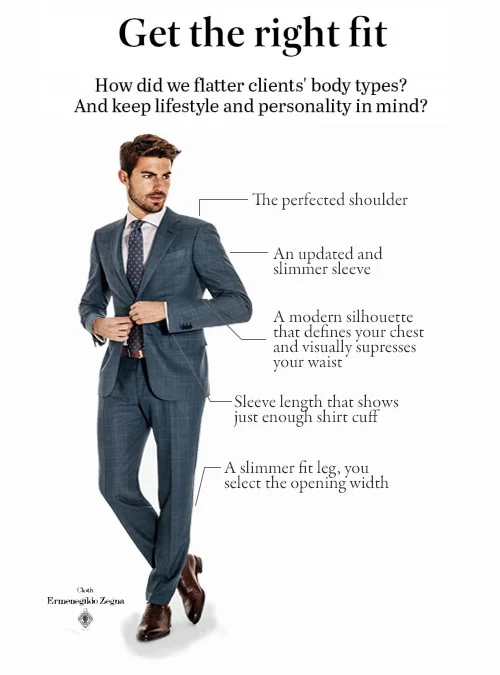 Our trained staff takes over 2 dozen measurements and fit preferences, in addition to taking photos of your posture and shoulder slope to share with our Master Tailor.