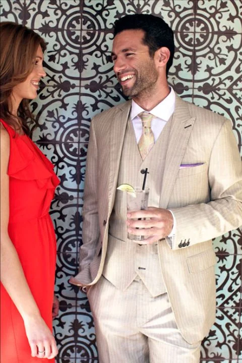 Opt for a 2 piece or 3 piece suit in a darker color for evening events or a lighter color daytime weddings. Add some fun accessories to drop a little pop.